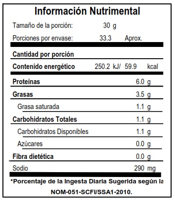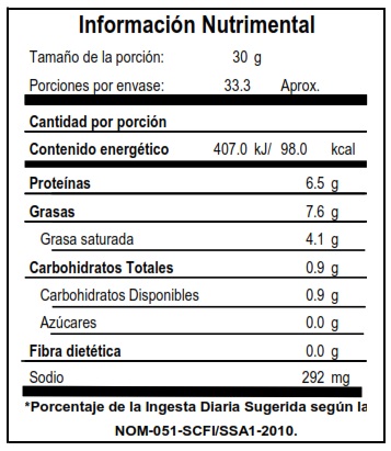 Queso madurado de pasta dura, sabor fuerte y salado, ideal para rallar y desmoronar sobre platillos mexicanos y fruta fresca.